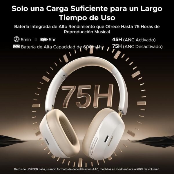 【Batería de Larga Duración y Carga Rápida】Los audífonos inalámbricos Bluetooth 5.4 se pueden cargar por completo en solo 1,5 horas. Con una batería de larga duración (45 horas con ANC ON, 75 horas con ANC OFF), los auriculares UGREEN se pueden utilizar durante una semana con una sola carga en caso de uso frecuente e incluso durante dos semanas en caso de uso ocasional. Con solo 5 minutos de carga, los auriculares se pueden utilizar de forma continua durante 5 horas.