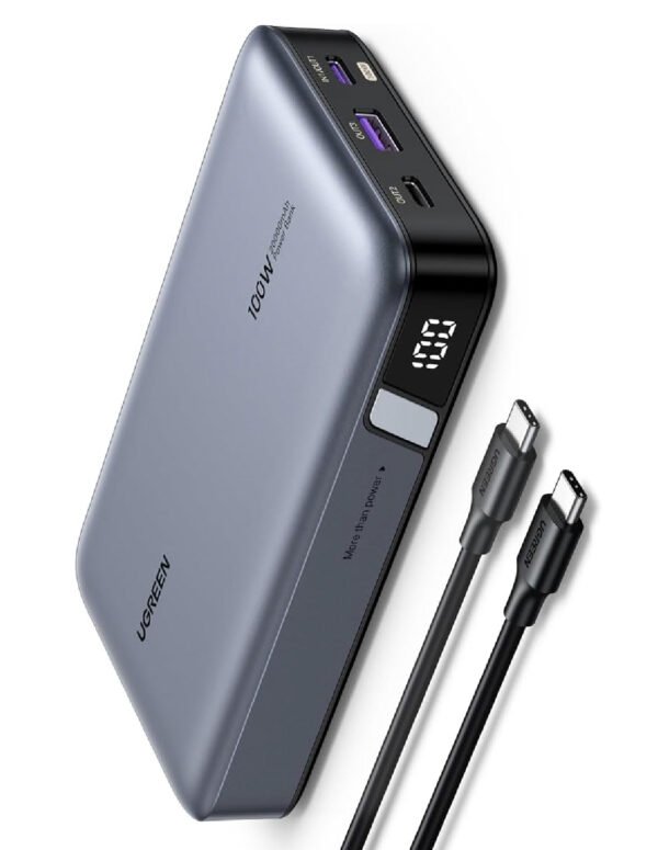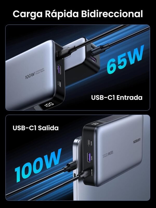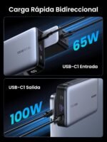 3 en 1 Carga Rápida: Con un total de 3 puertos (USB-C1: 100W Max; USB-C2: 30W Max; USB-A: 22,5W Max), esta ugreen power bank carga rapida garantiza una carga de alta velocidad y eficiente, puede cargar tres dispositivos al mismo tiempo, y también es compatible con la carga bidireccional, proporciona una potencia de entrada de 65W y se conecta a un cargador de 65W en el puerto USB-C1 cuando se carga solo
